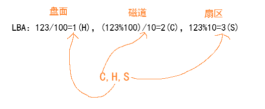 很简单,举个例子:现在一个盘面有10个磁道,而一个磁道中有10个扇区,也就是一个盘面就是100个扇区,现在给你一个LBA地址为123,让你得出CHS的数据。我们来看: