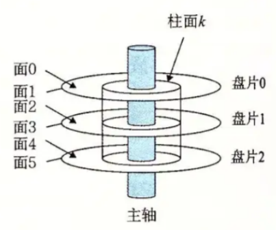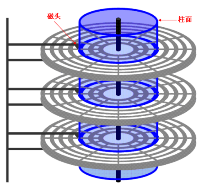 上面就显示了磁盘中的立体结构,在磁盘中一般是由多个盘面的,同时也就会有多个磁头,磁头和盘面是一对一的关系,一个面一个磁头。