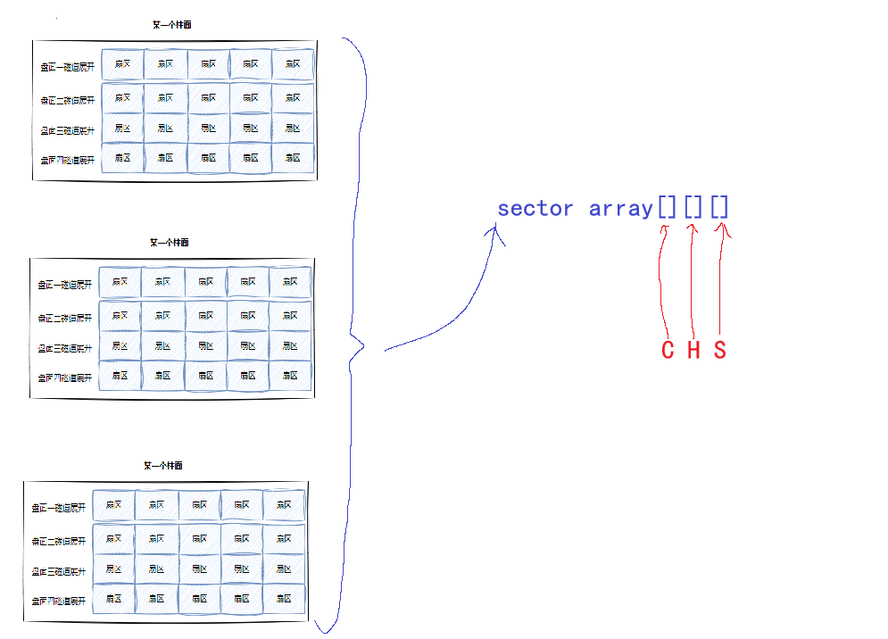 此时的磁盘,我们不就可以看成是一个三维数组了嘛,数组的第一个下标代表的就是柱面(磁道),第二个下标就表示磁头(选择哪一个磁道),第三个下标就表示扇区。