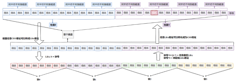 每个扇区都有LBA,那么8个扇区⼀个块,每⼀个块的地址我们也能算出来,知道LBA:块号 = LBA/8,知道块号:LBA=块号*8 + n. (n是块内第⼏个扇区)。