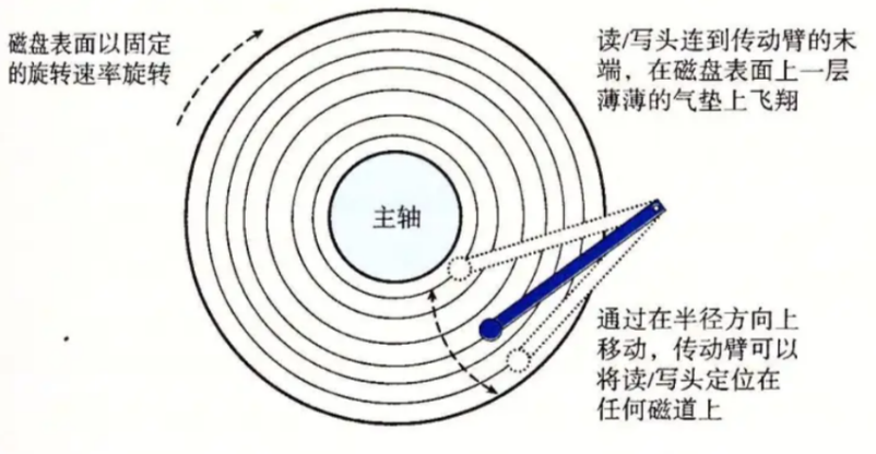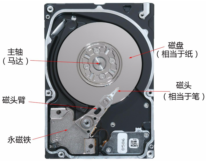 我们通过上图来观察硬盘的基本结构,硬盘中大概就分为上图的五部分:主轴,磁盘,磁头,磁头臂,永磁铁,我们后面的重点主要聚焦于磁盘和磁头,剩下的我们了解一下即可,主要是它们也没什么可讲的。