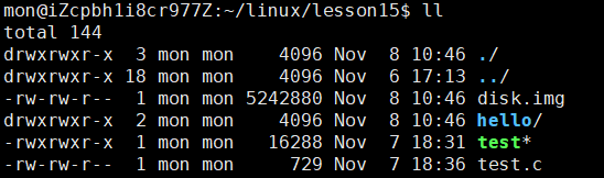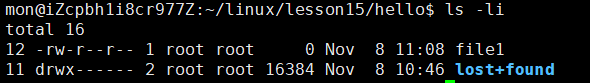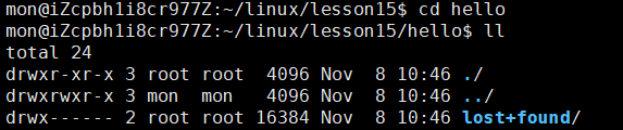 此时我们进到hello目录下可以看到有一个lost+found的目录,这个目录是根据ext4文件系统的找回机制相关方面所创建的,这里不用关心它。