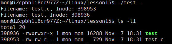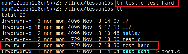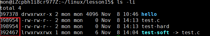 并且我们通过查看它们各自的inode,可以发现软链接是一个独立的文件,有自己的inode,但是硬链接文件和test.c的inode相同,说明它不是一个独立的文件,因为它没有自己的inode。