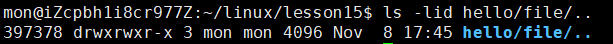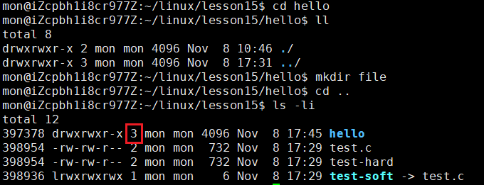 此时在hello目录文件中再新建一个file目录文件,为什么此时hello的硬链接数又变为3了呢?
