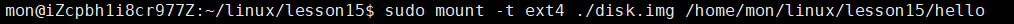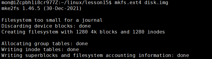 而第二步操作通过mkfs命令就是向这个分区中写入文件系统,对其进行格式化的操作,这里我向文件中写入的是ext4文件系统。