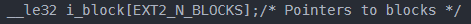 __le32 i_block[EXT2_N_BLOCKS];/* Pointers to blocks */