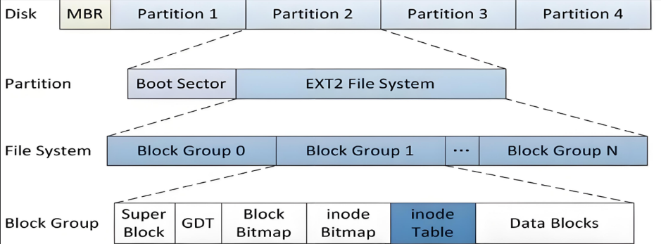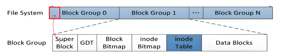 上面的结构也就是我们一个分区的结构,最上面就是不同的分区,下面就是我们的文件系统,最后就是我们下面要讲的块组。