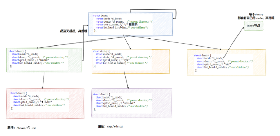 当我们打开的文件更多的时候,上面的结构体就会构成这样的树状结构,而在有了这样的树状结构后,我们后面再打开访问任何文件,都会优先在这棵树中根据路径进行查找,找到了就返回属性inode和内容,没找到就构造一个dentry接入这棵树中。