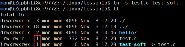 通过ln -s target link的命令形式,我们就生成了一个test-soft的软链接文件,命令中的-s就是soft的意思,而生成软链接文件后我们通过名字就可以看出这个软链接文件是链接的哪个文件。