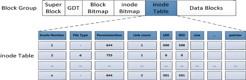我们可以看到,在一个块组中分为不同的区域,分别是:Super Block,GDT,Block Bitmap,inode Bitmap,inode Table,Data Blocks,下面我们就一一讲解这几个区域。