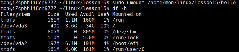 将相应分区所挂载的目录卸载umount后面就可以卸载相应的分区了,我们再次通过df -h命令查看就会发现已经没有我们所创建的分区的信息了。