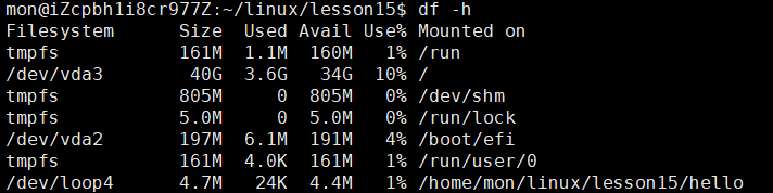 第三步操作就是通过mount命令将我们的分区挂载到指定的目录下,完成上面的操作后我们再次通过df -h命令就可以看到我们新创建的分区已经挂在到了上面我们指定的目录下。