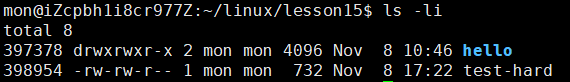 意思就是本来一个文件名对应一个inode,而有了硬链接后,就可以多个文件名对应一个inode,这有什么作用呢?我们来看一种现象: