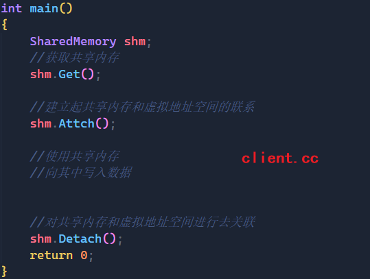 对于client来说,它不需要删除共享内存,这是server该做的,它只需要获取共享内存,建立联系,向内存中写入数据,对吼去关联即可。
