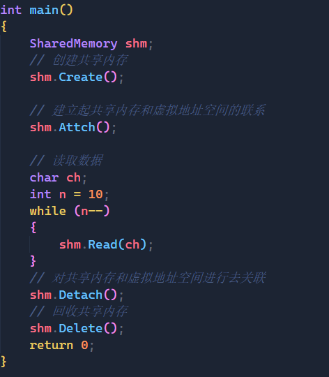 }既然上面已经将共享内存当做了一个char类型的数组,那我们读取的时候也按照char类型来读取。
