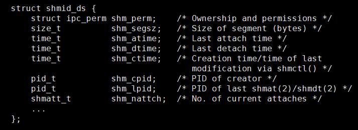 这个结构体呢就叫做shmid_ds,可以看到这个结构体有着共享内存的各种属性,比如:shm_srgsz就表示共享内存的大小,shm_atime表示最近一次挂接到虚拟地址空间的时间,就是个时间戳,再如shm_cpid就表示创建共享内存的进程的PID,等等各种属性。