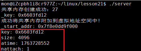 设置完权限后,我们再次执行就可以看到程序执行成功了,同时可以看到所映射的起始地址,并且查看共享内存的信息,权限也是我们所设置的,而后面的nattch属性也由0变为1,表示此时共享内存已经附加在一个进程的虚拟地址空间上了。