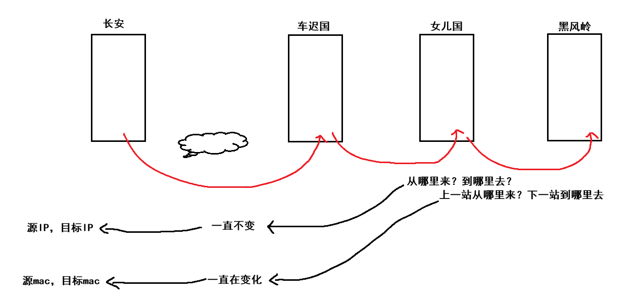 而对于一直不变的从哪里来和到哪里去分别对应的就是源IP地址和目标IP地址,而始终在变化的上一站从哪里来和下一站到哪里去分别对应的就是源mac地址和目标mac地址。