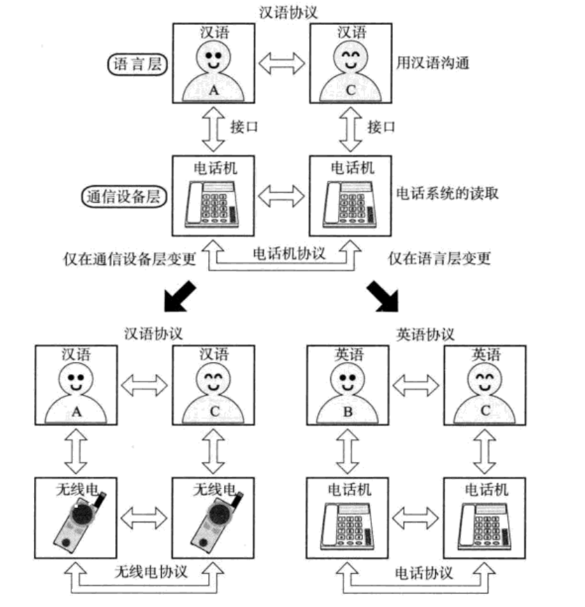 我们日常在打电话时,在语言层面我们都是用汉语在沟通,但是在通信设备层即电话机,它们可不是用汉语来进行沟通的,它们有自己的协议,通过遵守协议的内容,他们就能知道对面的电话机传来的信息是什么意思,进而对它进行解码,转化为我们能听懂的汉语。 在上面的例子中,我们的"协议"只有两层:语言层,通信设备层。可以很明显的看到,不同的层级,区别还是很大的。 而我们即便在通信设备层和语言层进行变更,只要遵守相应的协议,并不会影响我们的通信,这里我们就能很明确地感受到分层可以实现解耦合,让软件维护的成本更低。