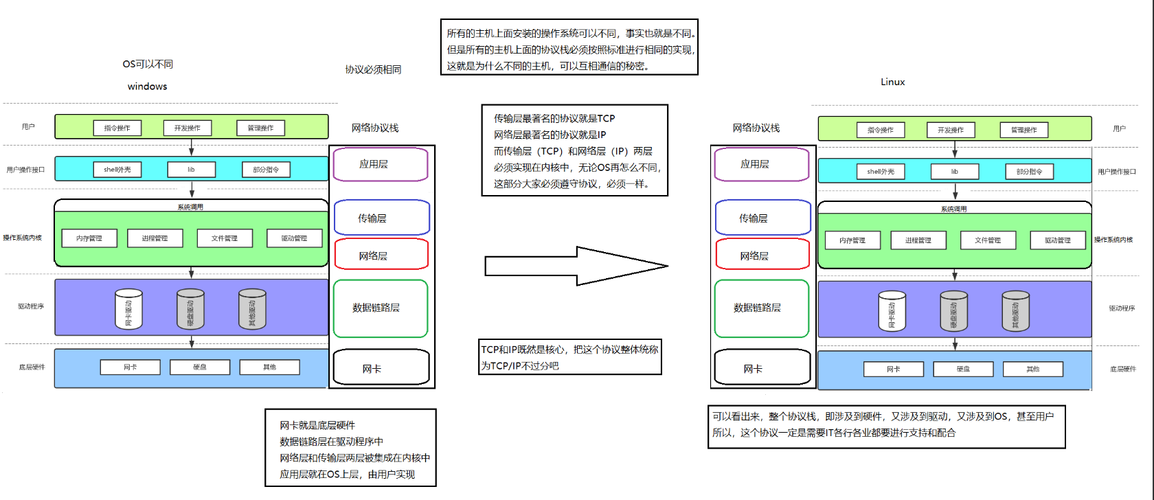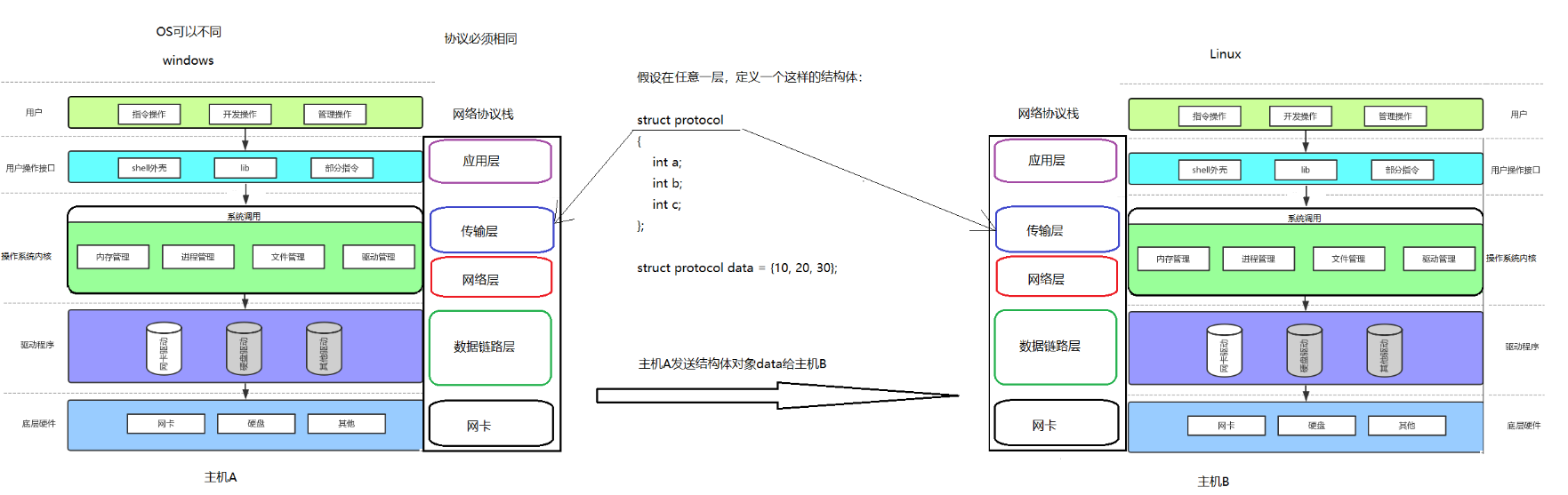 这里就是对上面不同的操作系统之间也能够进行网络通信更加具体的说明,也让我们对于协议有了更深刻的认识。