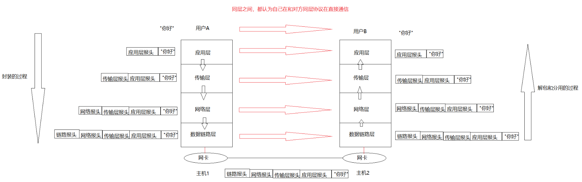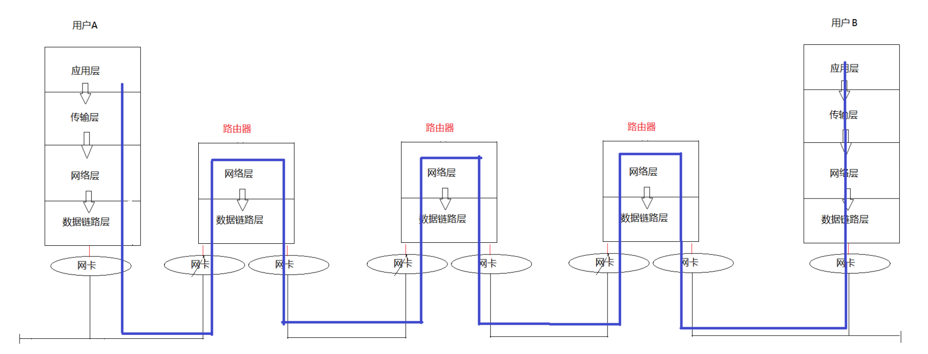 由左边的用户A向右边的用户B发送消息,按照网络协议栈的顺序从上到下一层一层地进行传递。