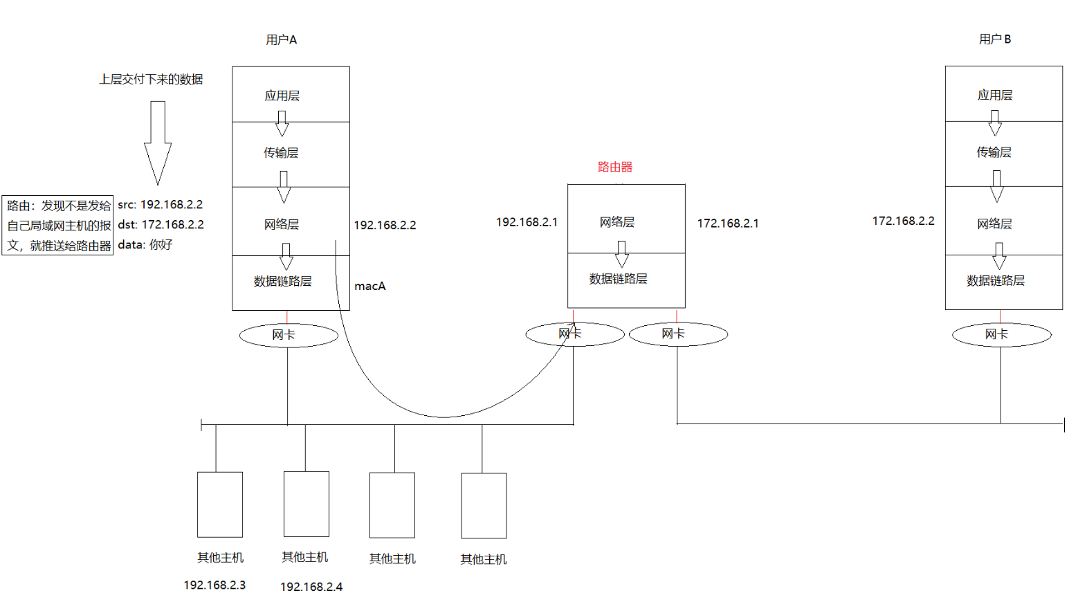 这里以经过一个路由器为例,当上层的数据交给网络层后,网络层会根据目的地址判断是否是当前局域网中的地址,那么是如何判断的呢?