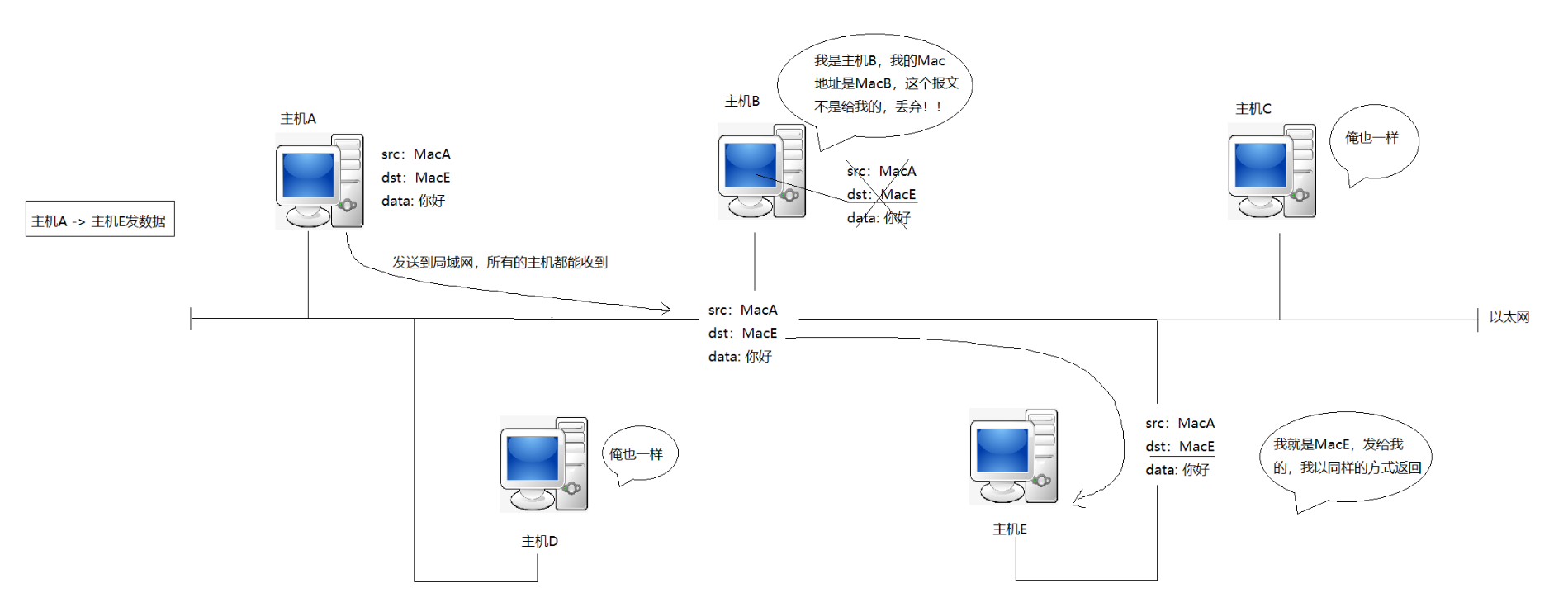 就比如此时主机A要向主机E发送消息,那么它所发出的信息中就包含了目的地址,这个目的地址就是主机E的MAC地址,所以主机E就知道这条信息是发给自己的。