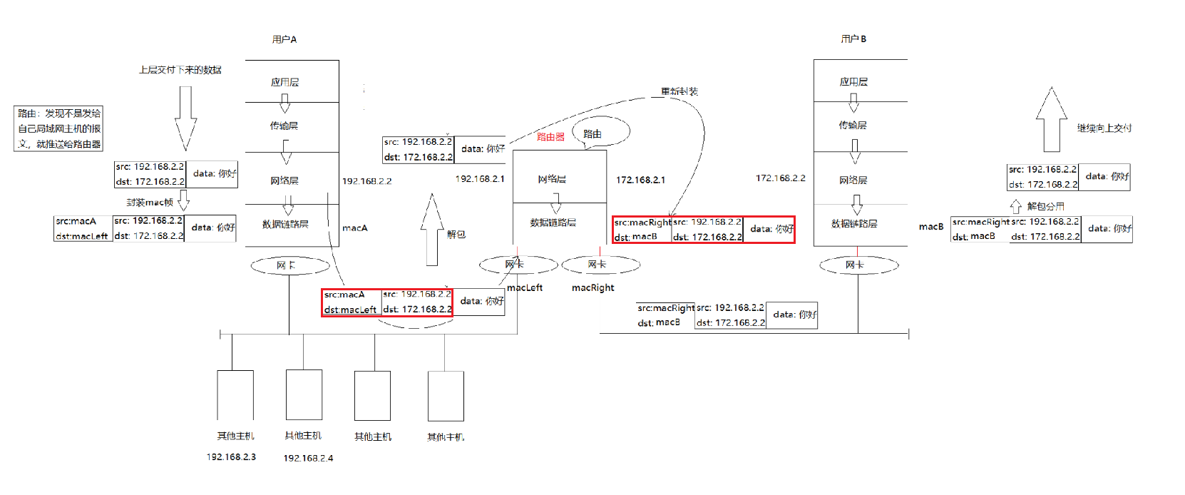 在这整个过程中,IP地址始终不变,mac地址始终在变化,也就是根据目的IP地址,会动态选择出我要经历的mac地址,也就是我要经历哪些主机或者路由器。