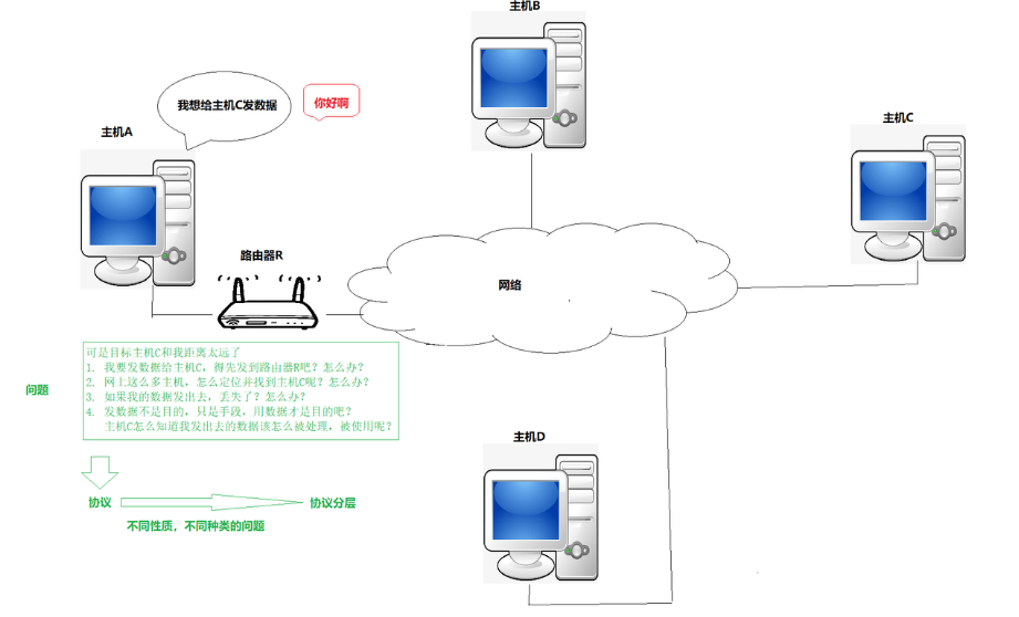 1.我要发送数据给主机C,得先发送到路由器R,怎么发? 2.网上这么多主机,怎么定位并找到主机C呢? 3.如果我的数据发出去,中途丢失了怎么办? 4.我们发送数据并不是目的,目的是让接收数据的另一台主机知道怎么处理这部分数据,怎么去使用,所以该怎么办?