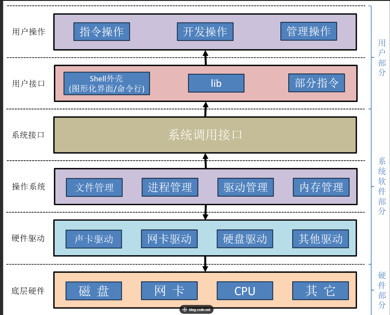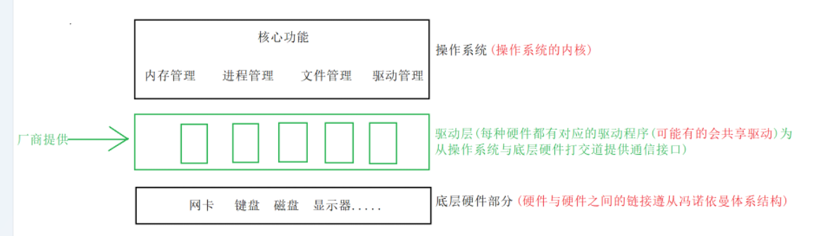 - 上层的任何操作最终都会反馈到底层硬件,操作系统接收上层请求后,会调用相关的底层硬件。然而,由于每一个硬件的特性不同,可能会导致需要修改硬件或操作系统以适配新设备。为了解决这种问题,在软件和硬件之间引入了一层驱动层.