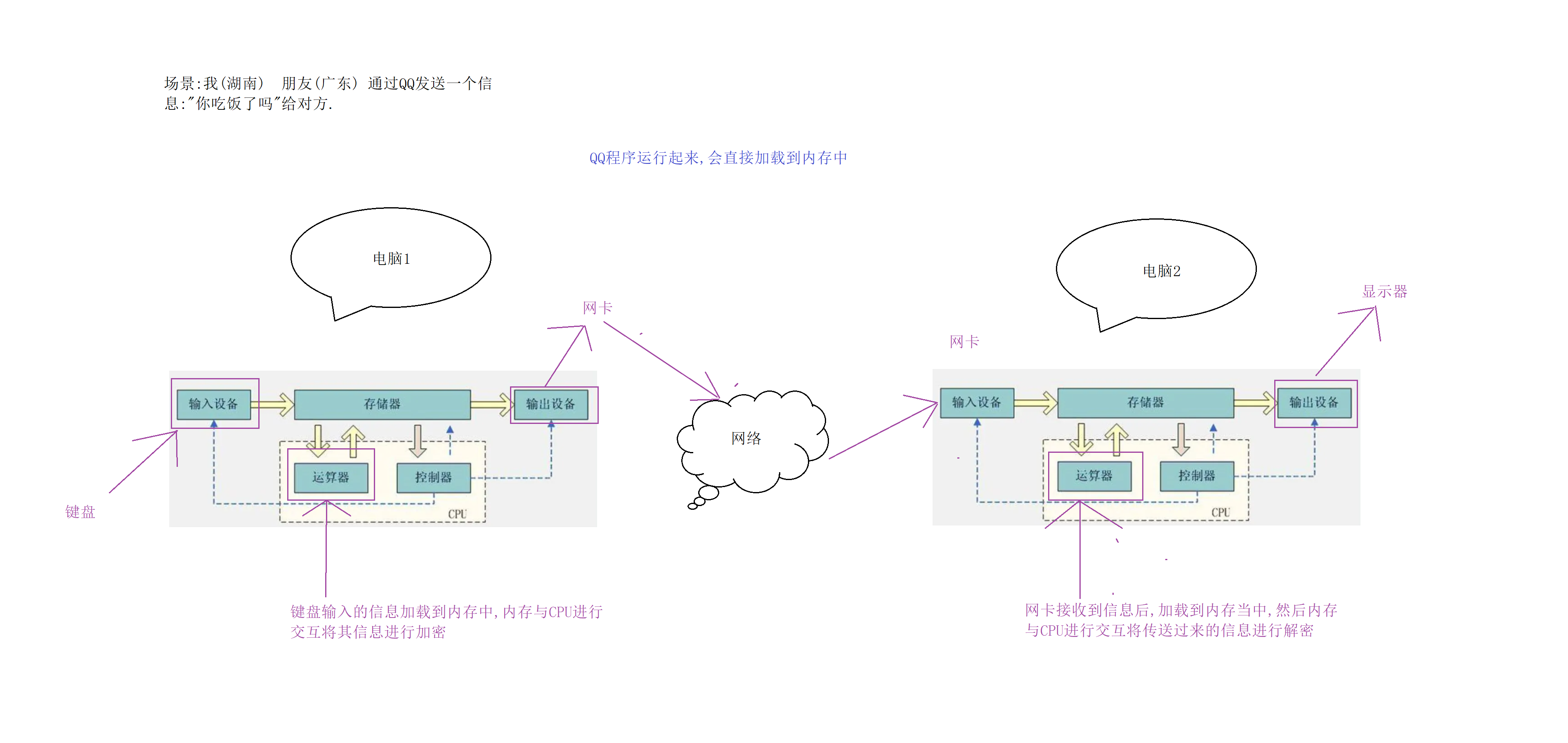 - 在键盘将消息加载到内存后,CPU从内存获取到消息后对消息进行各种封装,然后再将其写回内存,此时你的网卡就可以从内存获取已经封装好的消息,然后在网络中经过一系列的处理,之后你朋友的网卡从网络当中获取到你所发的消息后,将该消息加载到内存当中,你朋友的CPU再从内存当中获取消息并对消息进行解包操作,然后将解包好的消息写回内存,最后你朋友的显示器从内存当中获取消息并显示在他的电脑上.
