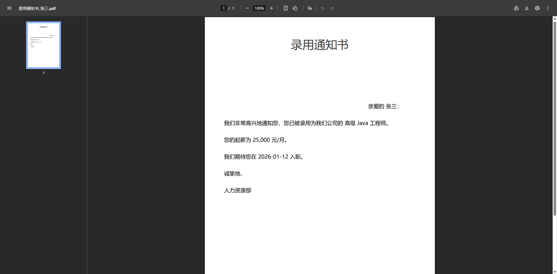 为了让你直观感受它的强大,我写了一个简单的 Demo。这是一个录用通知书生成器,前端输入信息,后端实时生成 PDF 下载。