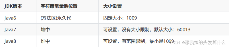 字符串常量池在JVM中是StringTable类,实际是一个固定大小的HashTable(一种高效用来进行查找的数据结构,后序给大家详细介绍),不同JDK版本下字符串常量池的位置以及默认大小是不同的: