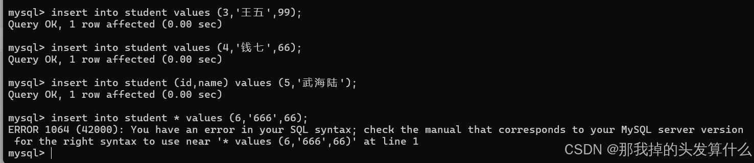 value_list: value, [, value] .。。案例: 先创建一个学生表: