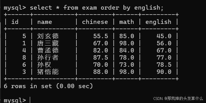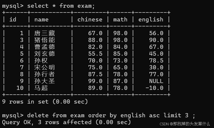 DELETE FROM table_name [WHERE ...] [ORDER BY ...] [LIMIT ...]删除孙悟空的所有成绩:
