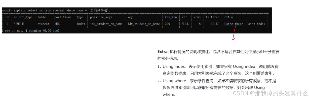 • 当⼀个select语句使⽤了普通索引且查询列表中的列刚好是创建普通索引时的所有或部分列,这时就可以直接返回数据,⽽不⽤回表查询,这样的现象称为索引覆盖