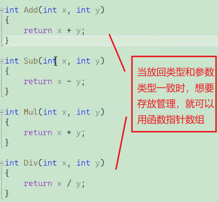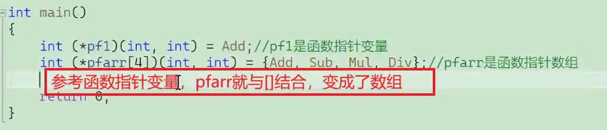 先类比一下指针数组int *arr[10],说明数组是可以存放指针的,当数组存放的是函数指针时,那就是函数指针数组