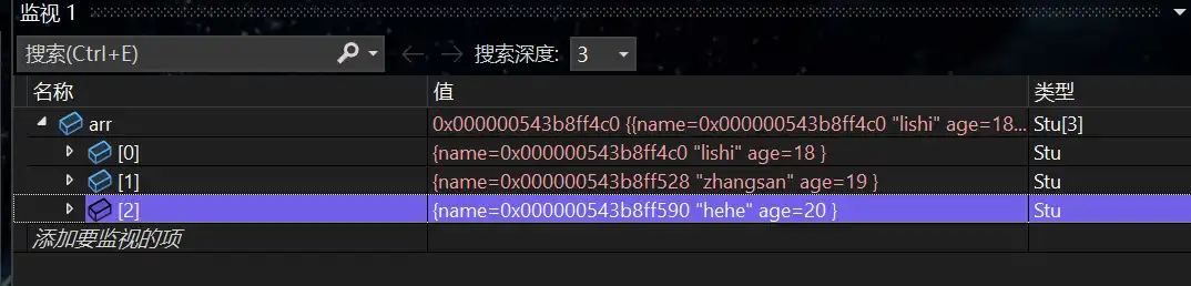 struct Stu arr[] = { {.name = "zhangsan",.age = 18},{"lishi",19},{"hehe",20} };