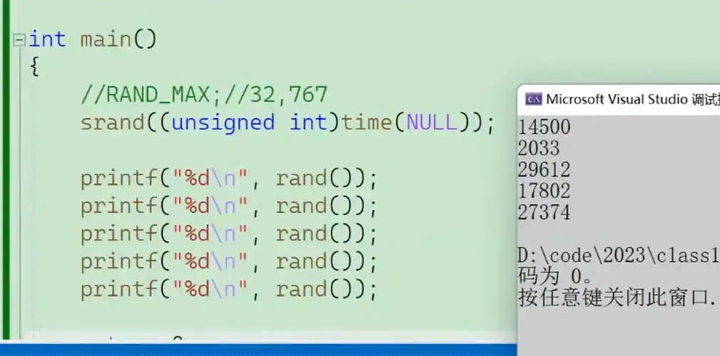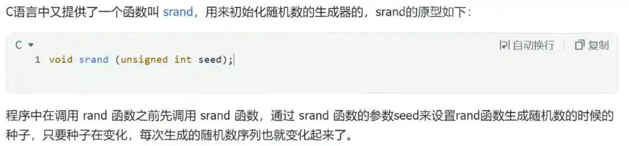但是每次运行,生成的结果是一样的,并且是伪随机数(由算法生成的),rand函数是对一个叫“种子”的基准值进行运算生成随机数,之所以之前生成的随机数是一样的,因为默认种子是“1”,要每一次生成不同的随机数,必须要让种子变化。 可以通过srand来设置rand函数的种子
