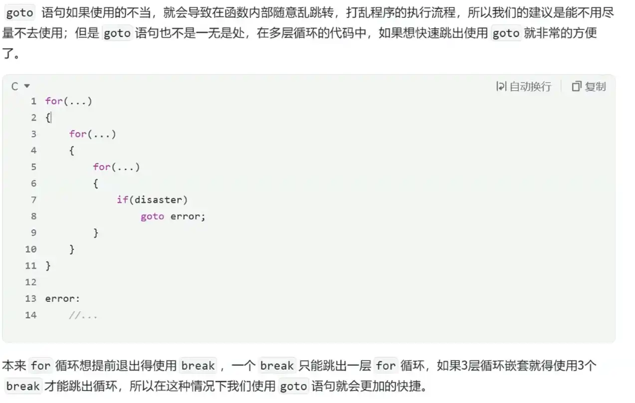 }goto语句由goto语句和跳转标号组成,注意:goto语句只能在同一个函数内部使用 使用场景: