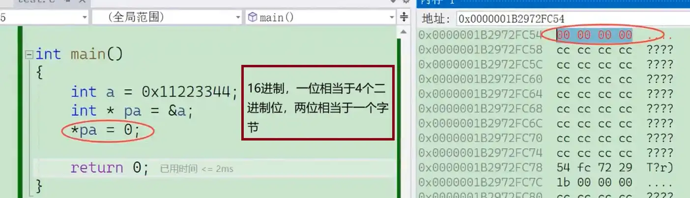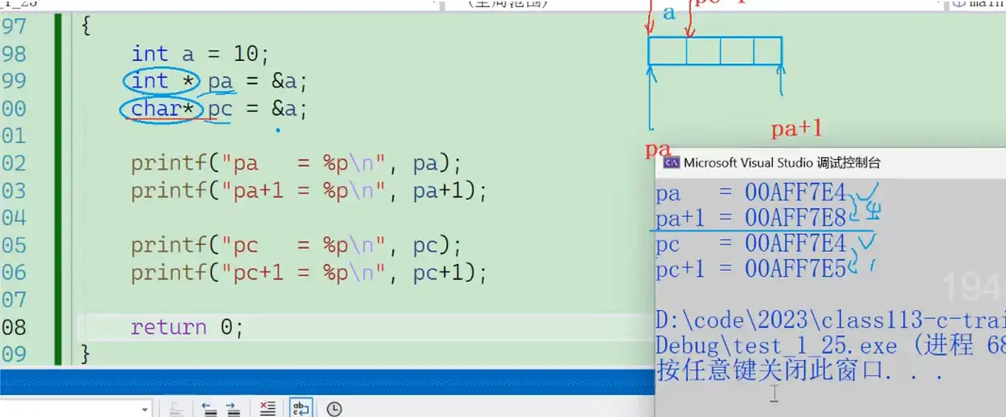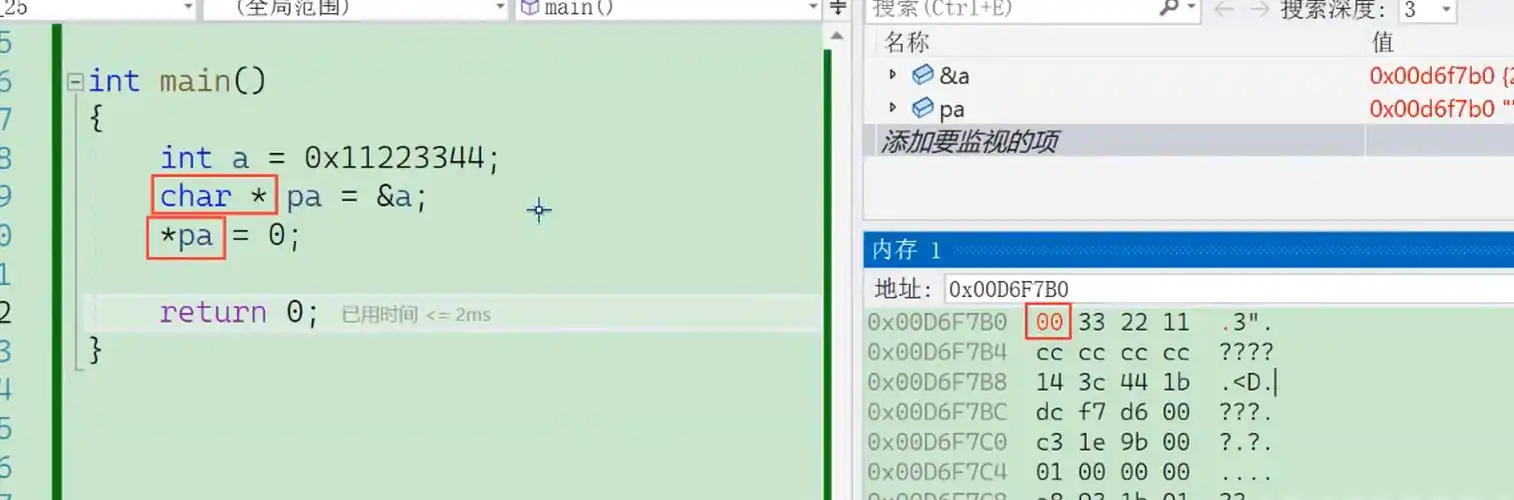 指针变量类型让他觉得自己是个指向什么类型的指针,只访问该类型大小的字节 对比图: