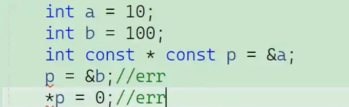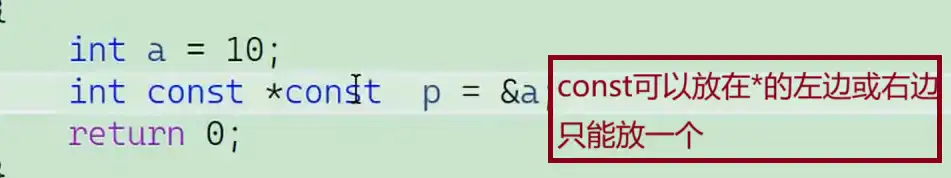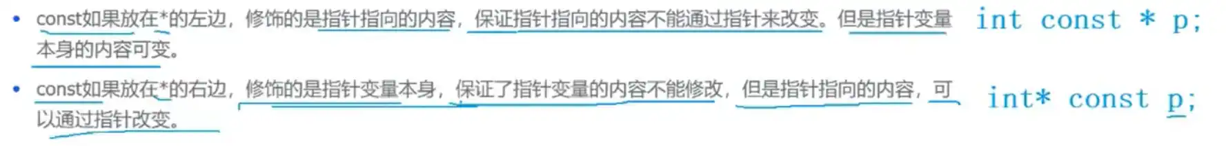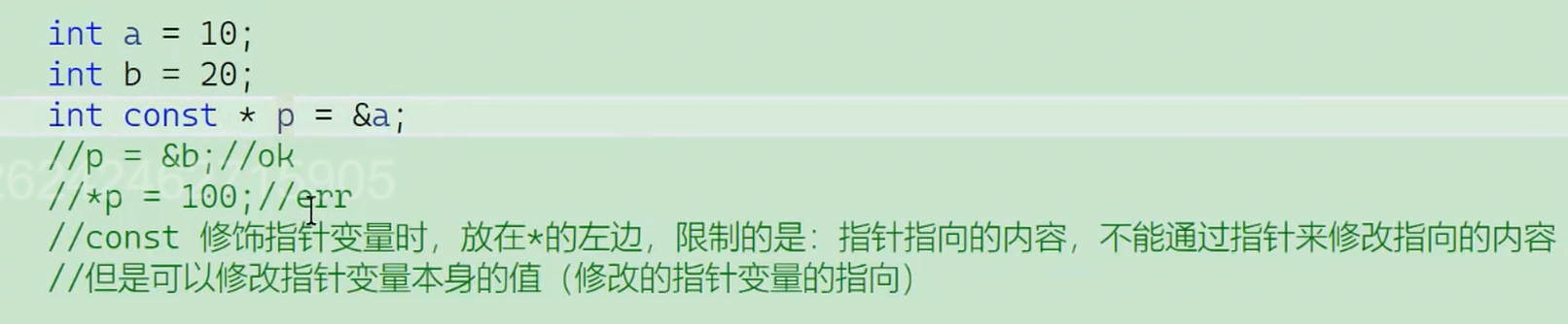 const限制的是指针变量本身,指针变量不能再指向其他变量了,但是可以通过指针变量,修改指针变量指向的内容