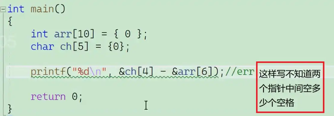 并且,指针加指针没有任何的意义 注意:指针减指针的前提条件是两个指针指向同一块空间 否则:(如图所示)