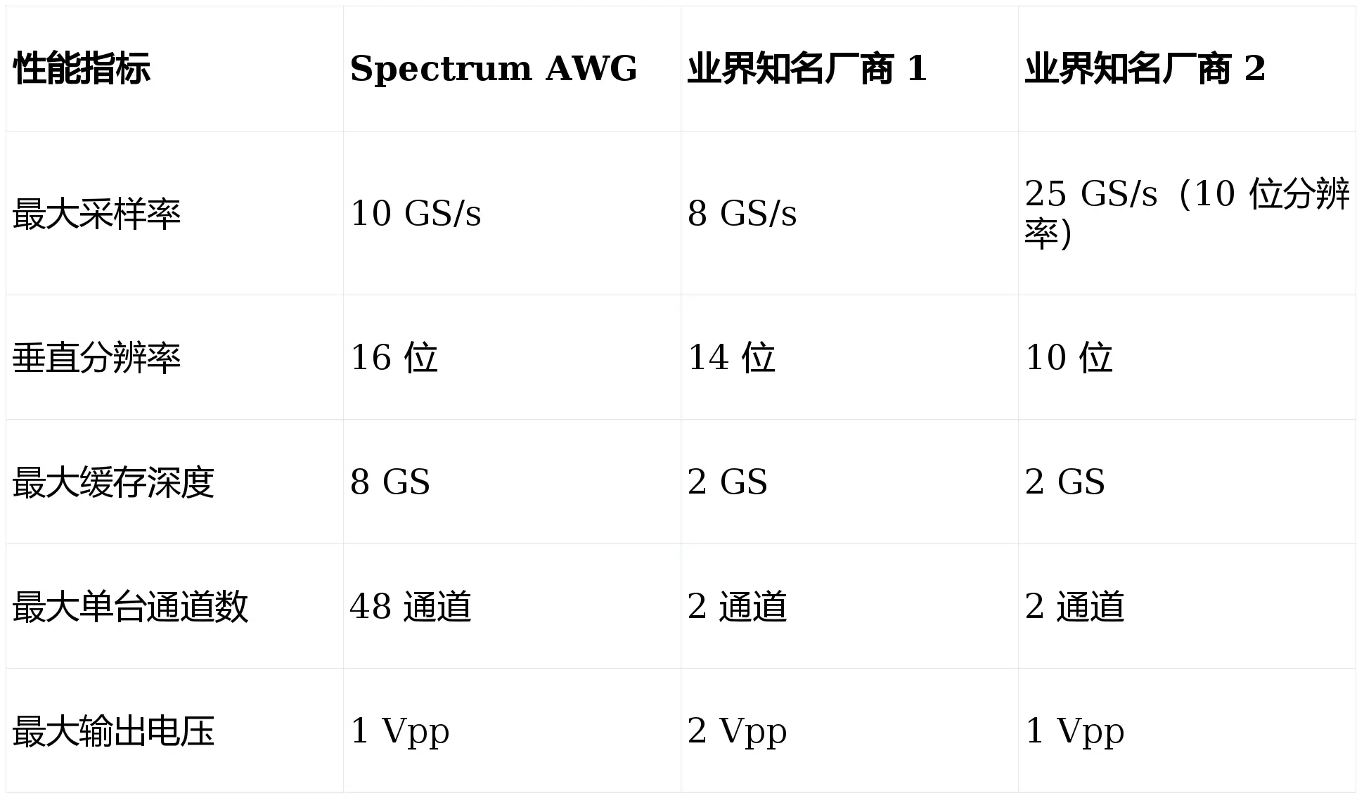 对比行业同类产品,Spectrum AWG 在高速采样与高精度还原的平衡上表现突出,核心参数适配量子通信、光电测试等对信号细节要求严苛的场景:
