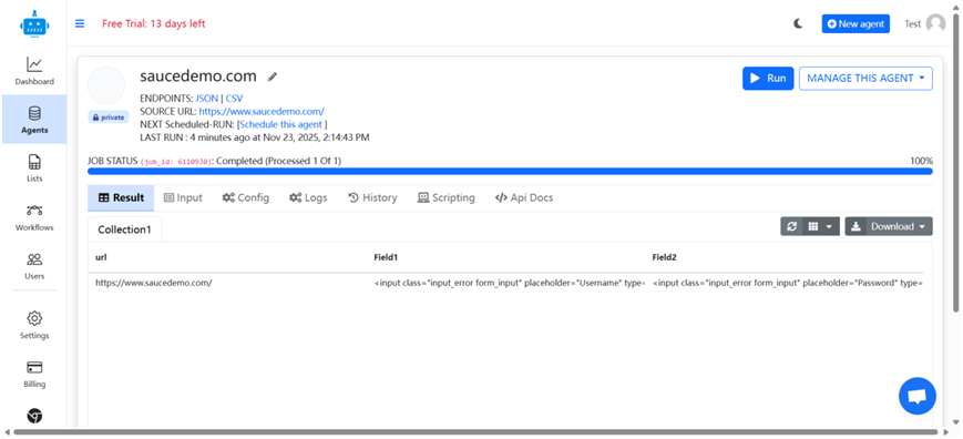 Agenty 是一款AI 驱动的无代码网页抓取软件,可在30 秒内构建网页抓取代理,核心功能包括批量 URL 抓取、自动分页与滚动加载、基于住宅代理的匿名抓取,能提取网站中产品名、描述、价格等有价值信息以助力业务研究与竞品分析;支持JSON/CSV 格式数据输出,提供截图 API、自动提取 API、HTML 内容获取 API等开发者工具,可通过预处理 / 后处理 JavaScript 自定义数据,还具备Data As A Service(数据专家团队提供全流程数据服务)与完善的任务监控(含日志调试、状态追踪)功能。