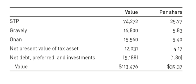 将STP的这些不同资产汇总在表2中(同时忽略该公司其他所有业务部门的情况),就可以看出该股票的实际价值了,其价值超过了巴菲特最初以18美元购买的股票价格的两倍。