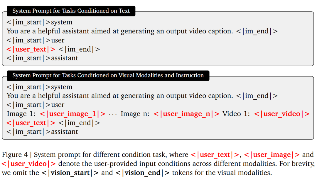 为了处理多种形式的输入,本工作采用冻结的 VLM 模型作为所有语言和视觉条件的前端编码器。如图 4 所示,系统提示词(System Prompt)会根据输入模态的存在与数量而变化。当没有提供视觉模态时,用户仅提供文本输入,这作为文生图或文生视频生成的唯一条件。当存在视觉输入时,它们首先按类型(先图像,后视频)排序并放置在提示词的开头,每个输入被分配一个唯一的标识符,如 Image 1 或 Video 1。用户随后可以在文本输入中引用这些标识符来指定不同的视觉条件,从而实现复杂的多模态控制。此外,本工作在提示词末尾附加了一组可学习 Token(Learnable Tokens),将跨模态特征提取到一个共享空间中。这些 Token 同样使用因果掩码(Causal Masking)处理,而非给予全双向注意力。最后,使用 VLM 倒数第二层的隐藏状态作为编码后的条件,应用两层多层感知机(MLP)进行特征投影,然后输入到后续的 MMDiT 中。