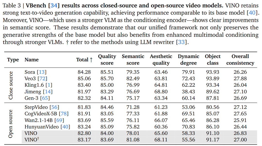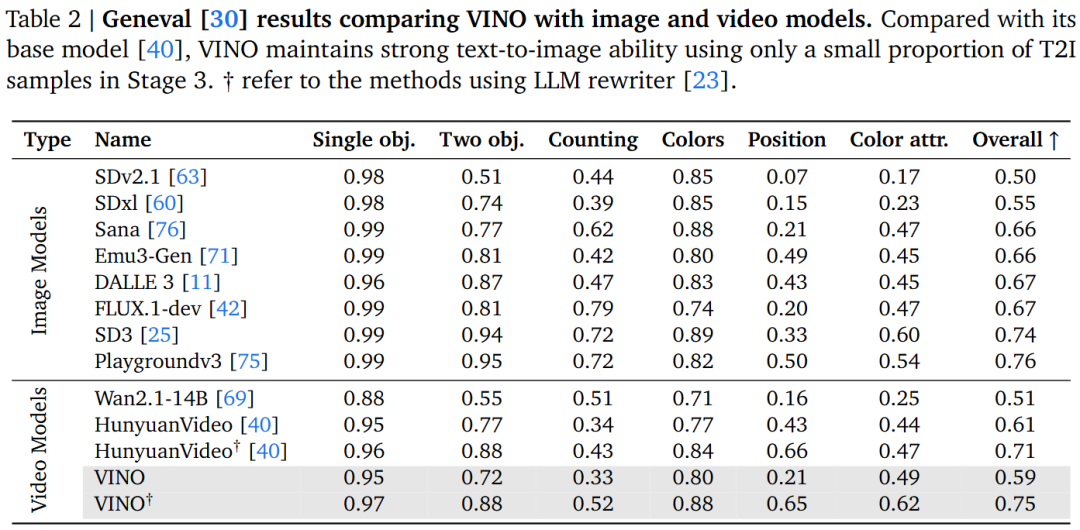 - 基础能力保持:尽管在 Stage 3 中标准的文生图/文生视频数据占比很小,但在 Geneval 和 VBench 基准测试中,VINO 的性能指标与 HunyuanVideo 骨干网络高度相当。证明了训练策略有效避免了灾难性遗忘。