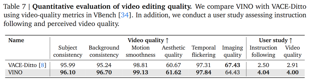 - 指令遵循与一致性:相比基线模型,VINO 在遵循复杂指令、保持参考图像/视频的身份特征(ID preservation)方面表现更优,尤其是在多身份编辑场景下。