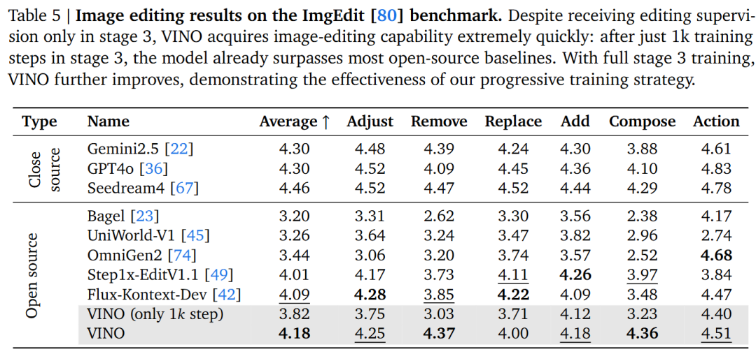 - 图像编辑:在 ImgEdit 和 GEdit 基准测试中,VINO 在仅经过 Stage 3 的少量训练后(1k 步),其编辑能力就迅速超越了大多数开源基线。这得益于渐进式训练带来的强大指令遵循能力。